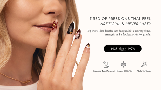 Leonie London press-ons are handmade, gel-based enhancements crafted in small batches for a truly luxury, salon-level finish.Unlike standard "plastic tips with colour," our sets are built using high-viscosity premium gels, layered and cured to achieve the correct structure, strength, and balanced weight, mimicking the process of a high-end nail technician.Our designs are intended to feel like couture on your fingertips.